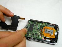 Using tweezers, lift up the retaining flap on the ZIF connector securing the button panel ribbon cable.