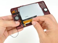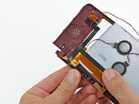 Grasp the camera and upper LCD ribbon cables between your thumb and forefinger, pulling them out of the upper case slightly, slide them down through the slit in the upper case.