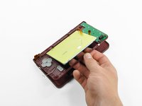 Remove the two Phillips screws securing the battery cover to the back of the handheld console.