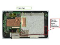 The large patch of copper tape highlighted in figure three needs to be pulled off slowly. After this, the speaker on one of the short edges of the device can be easily removed.