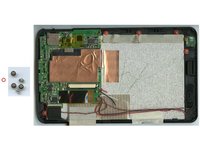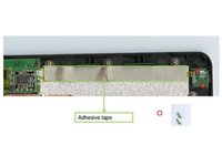 Next, a one-sided adhesive close to one of the outer edges of the device (close to the headphone connectors) needs to be removed. The two crews that are marked in the second figure can be removed using a #00 screw driver.