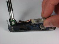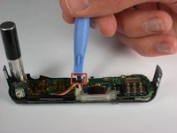 Using a plastic prying tool, flip up the latch that holds the thin ribbon in place.