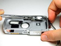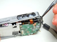 With tweezers, carefully detach the ribbon on the upper right corner of the internals that is connected to the shutter release/power button.