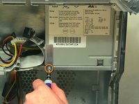 Remove the single screw on the side of the power supply casing with the Phillips #1 screwdriver.