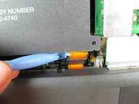 Use the plastic opening tool to lift up the tabs on either side of the ribbon cable port and then gently pull the ribbon cable free.