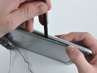 Insert the spudger between the left edge of the front display bezel and the plastic strip attached to the rear bezel, with the edge of the tool angled toward the LCD.