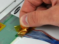Use the flat end of a spudger to remove the piece of foil tape securing the display data cable to the LCD frame.