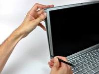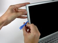 Insert a spudger just to the right of the hinge opening on the top edge of the display between the front display bezel and the plastic strip attached to the rear bezel.