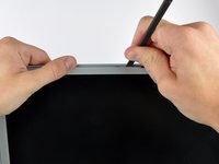 Insert a plastic opening tool between the right edge of the front display bezel and the plastic strip attached to the rear bezel, with the edge of the tool angled toward the LCD.