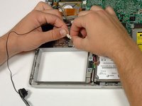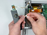 Lift the left side of the logic board and disconnect the modem cable from the underside of the logic board. A spudger is useful for freeing the connector from its adhesive.