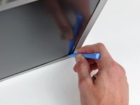Insert the flat end of a spudger between the rear display bezel and the plastic surround of the front display bezel near the lower left corner of the display.