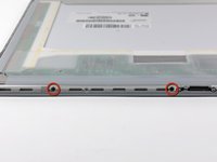 From each complete hinge assembly, remove two Torx T6 screws from the outside of each set, leaving two remaining in the middle of each hinge. On each side, the two screws closer to the edge of the computer are shorter than the two screws closer to the center of the computer. Then remove the two inner screws from each hinge assembly. There are 8 screws total.