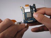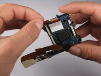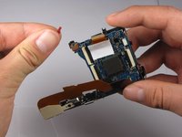 Pull back the small gray clip located on the right side of the camera to release the motherboard from its casing.