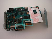 Remove the two screws that are adjacent to the warning label, which is on the underside of the camera.