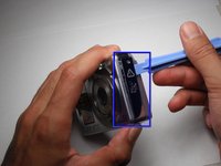 Remove the screw with a Phillips #00 Screwdriver from the right side of the camera (with '3x optical zoom' engraved on the side panel).