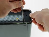 Insert a metal spudger between the black bottom vent and the silver rim of the bottom bezel, in the rear right corner of the vent.