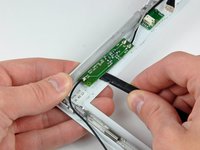 Remove the two pieces of tape over the display data/microphone cables near the lower edge of the display.
