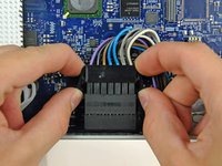 Disconnect the DC-in cable by simultaneously depressing both locking arms and pulling its connector away from the socket on the logic board toward the top of your iMac.