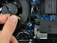 De-route the left speaker cable from the channel in the CPU fan. Continue completely de-routing the cable through the undersides of the IR board and heat sink.