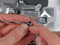 If present, remove the pieces of clear tape securing the ambient temperature sensor cable and the left speaker cable to the rear case.