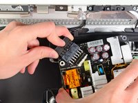 Carefully lift the power supply out of the outer case and rotate it to expose the cable lock as shown, minding the DC-out and AC-in cables still attaching it to the iMac.