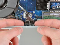 Pull the black plastic tab attached to the display data cable connector to disconnect it from the logic board.