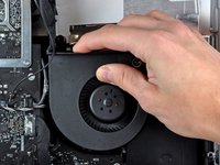 Carefully maneuver the optical drive fan out of the iMac, minding any cables that may get caught.