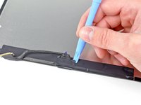 Using the opening pick that is still underneath the bottom edge of the iPad, release the adhesive along the bottom left corner.