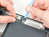 Using the opening pick that is still underneath the bottom edge of the iPad, release the adhesive along the bottom left corner.
