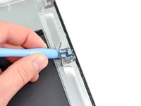 Using the opening pick that is still underneath the bottom edge of the iPad, release the adhesive along the bottom left corner.