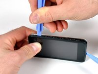 Insert the small plastic opening tool into the seam in between plastic display panel and the metal back panel. The angled edge should point towards the metal back panel.