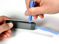 Insert the small plastic opening tool into the seam in between plastic display panel and the metal back panel. The angled edge should point towards the metal back panel.